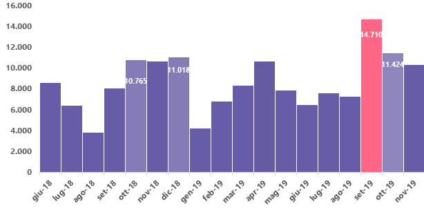 Passando agli incentivi, in particolare, ad incidere sull’incremento di novembre contribuiscono le isole, nello specifico la regione Sardegna che in qualità di soggetto titolare ha generato 28 mila CUP per piccoli importi stanziati di circa 5 mila euro a valere sul Fondo europeo di sviluppo agricolo regionale FEASR, su un totale di numero di progetti di incentivi alle imprese generati di 122.532.