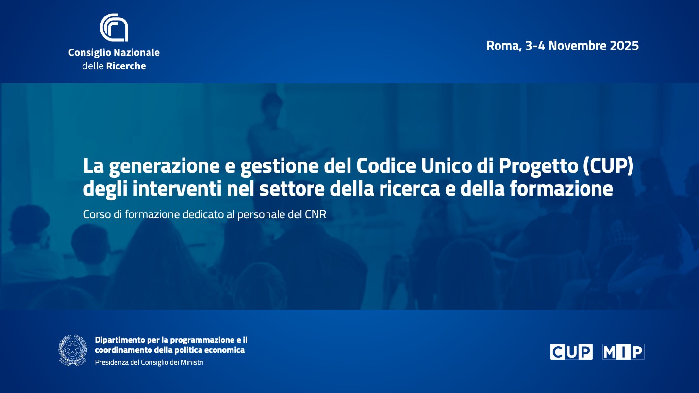 La Presidenza del Consiglio dei Ministri – Dipartimento per la programmazione e il coordinamento della politica economica (DiPE), Ufficio V Monitoraggio degli investimenti pubblici, in collaborazione con il Consiglio Nazionale delle Ricerche (CNR) – Ufficio Supporto alla Ricerca e Grant, organizza un corso di formazione rivolto al personale CNR referente per la generazione del Codice Unico di Progetto (CUP).